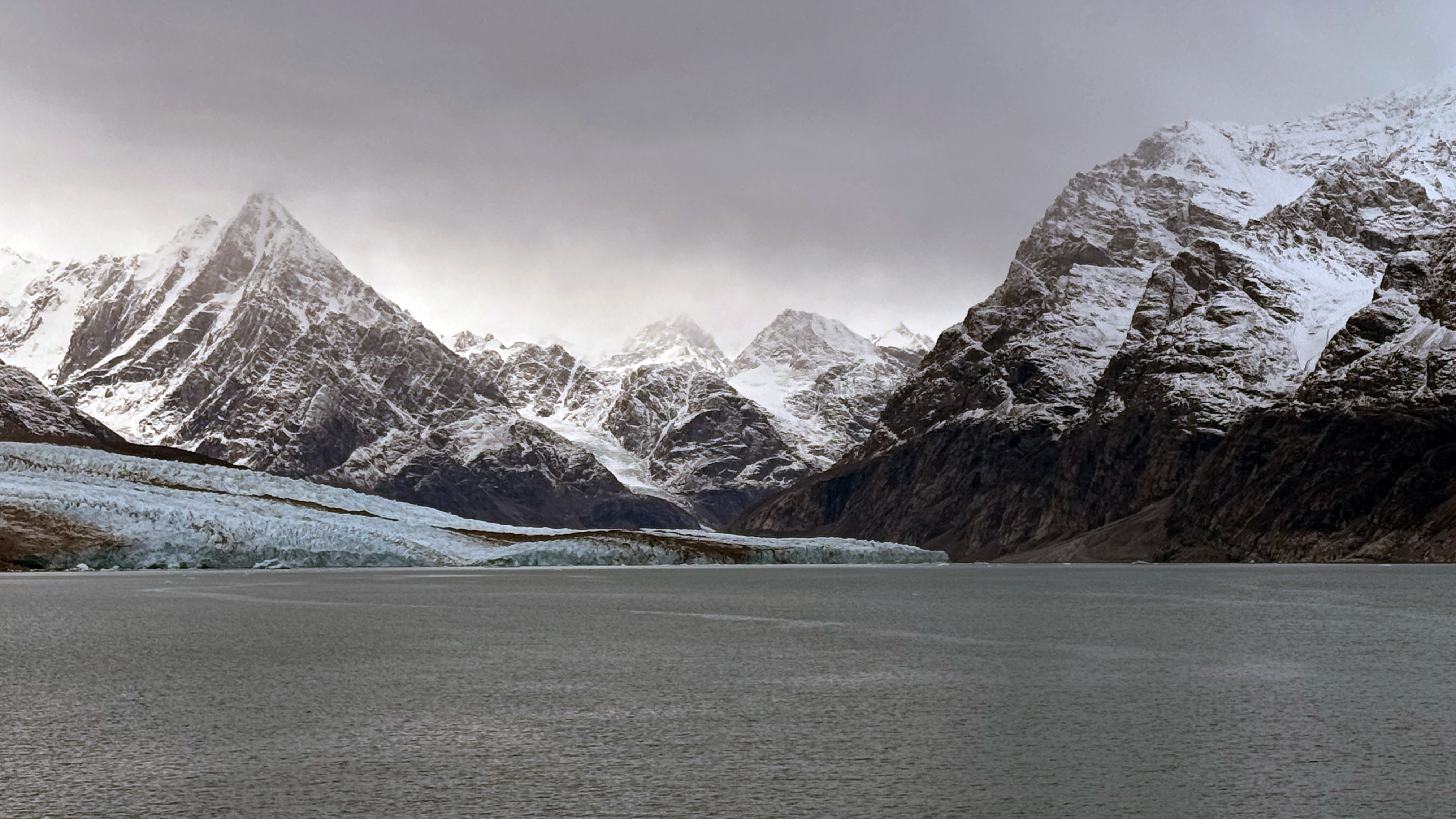 Mountains and glacier in the mist, Alpefjord, Northeast Greenland National Park