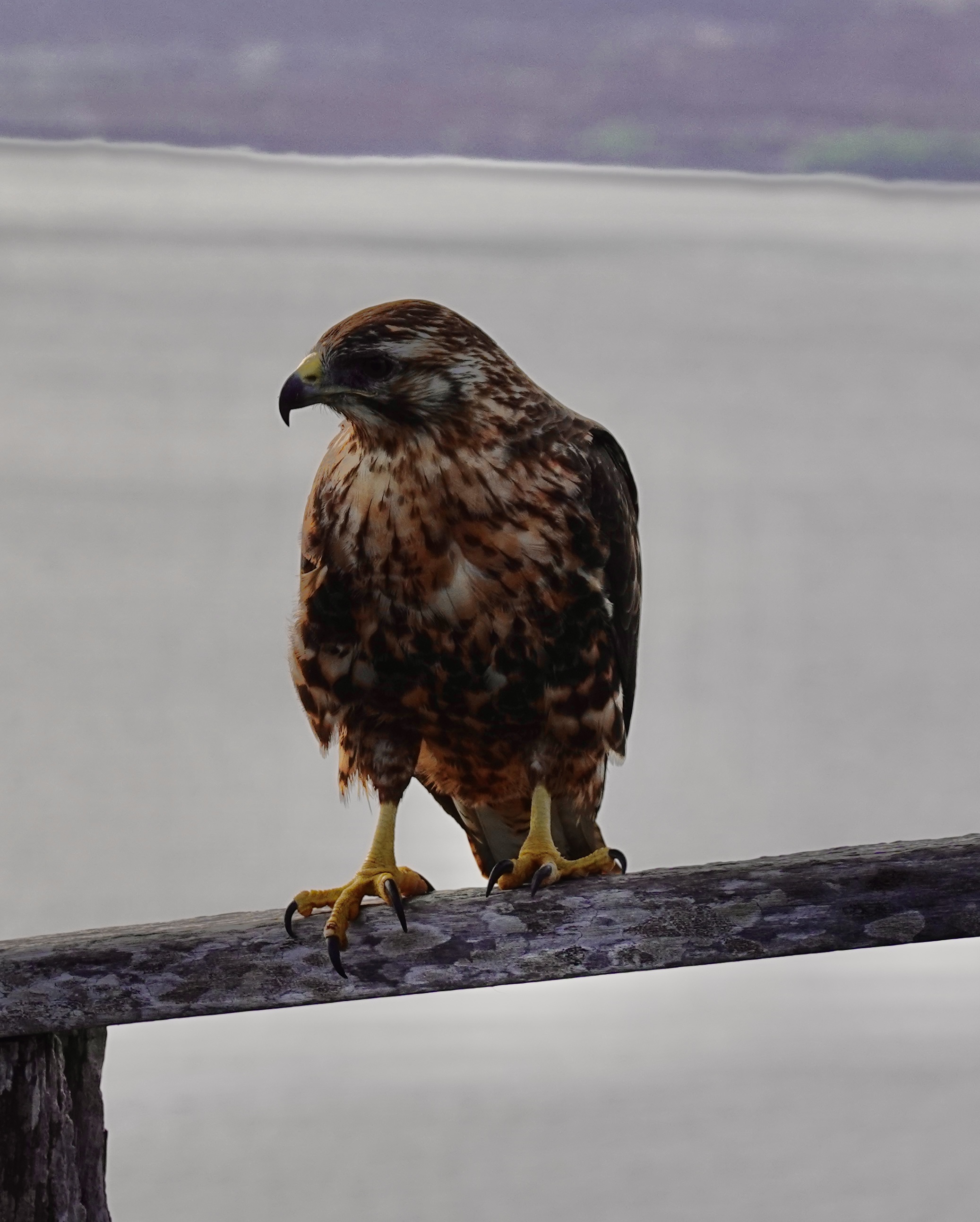 A flock of pelicans, a fog bank, and one large crane, Valparaíso, Chile