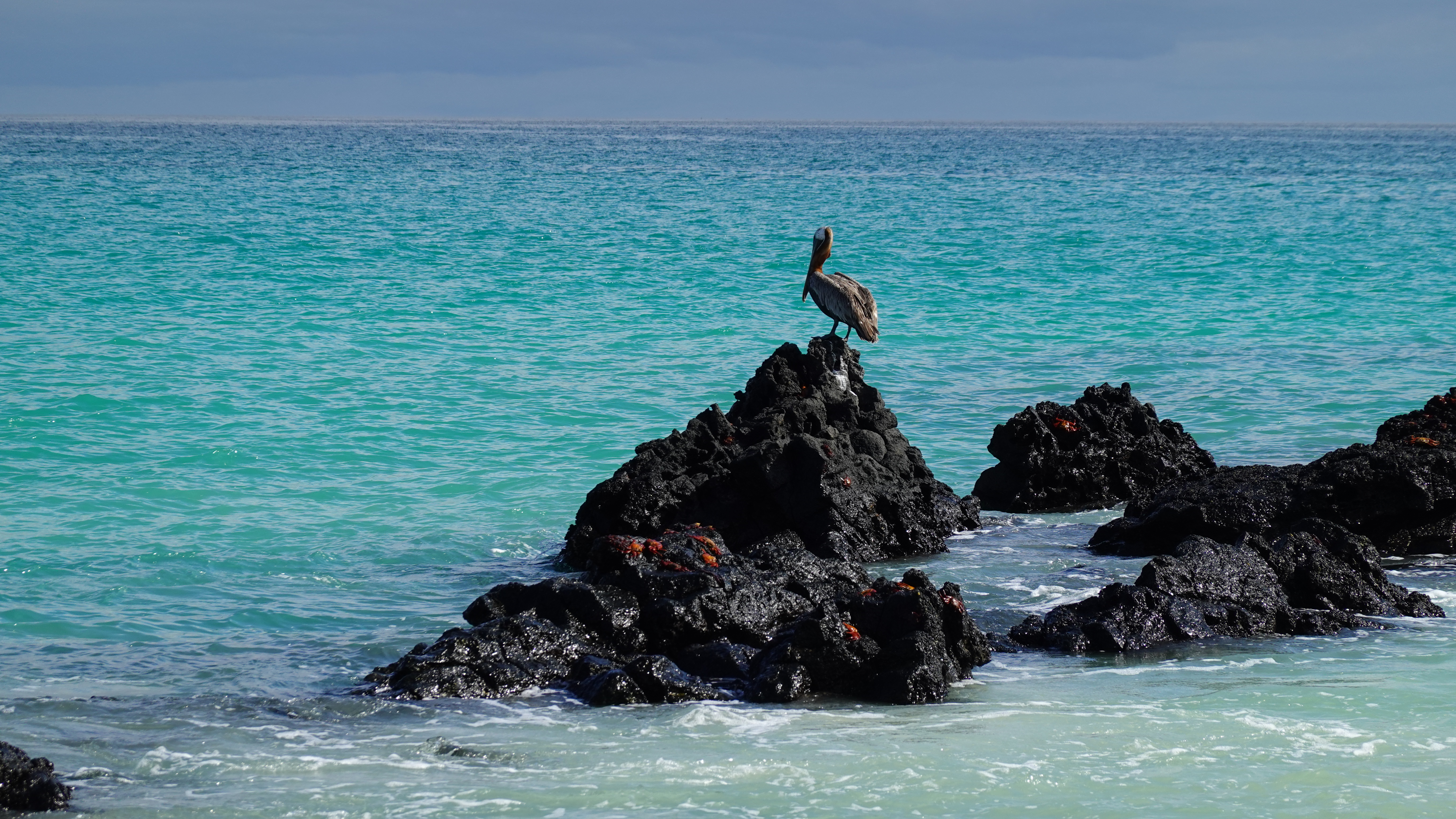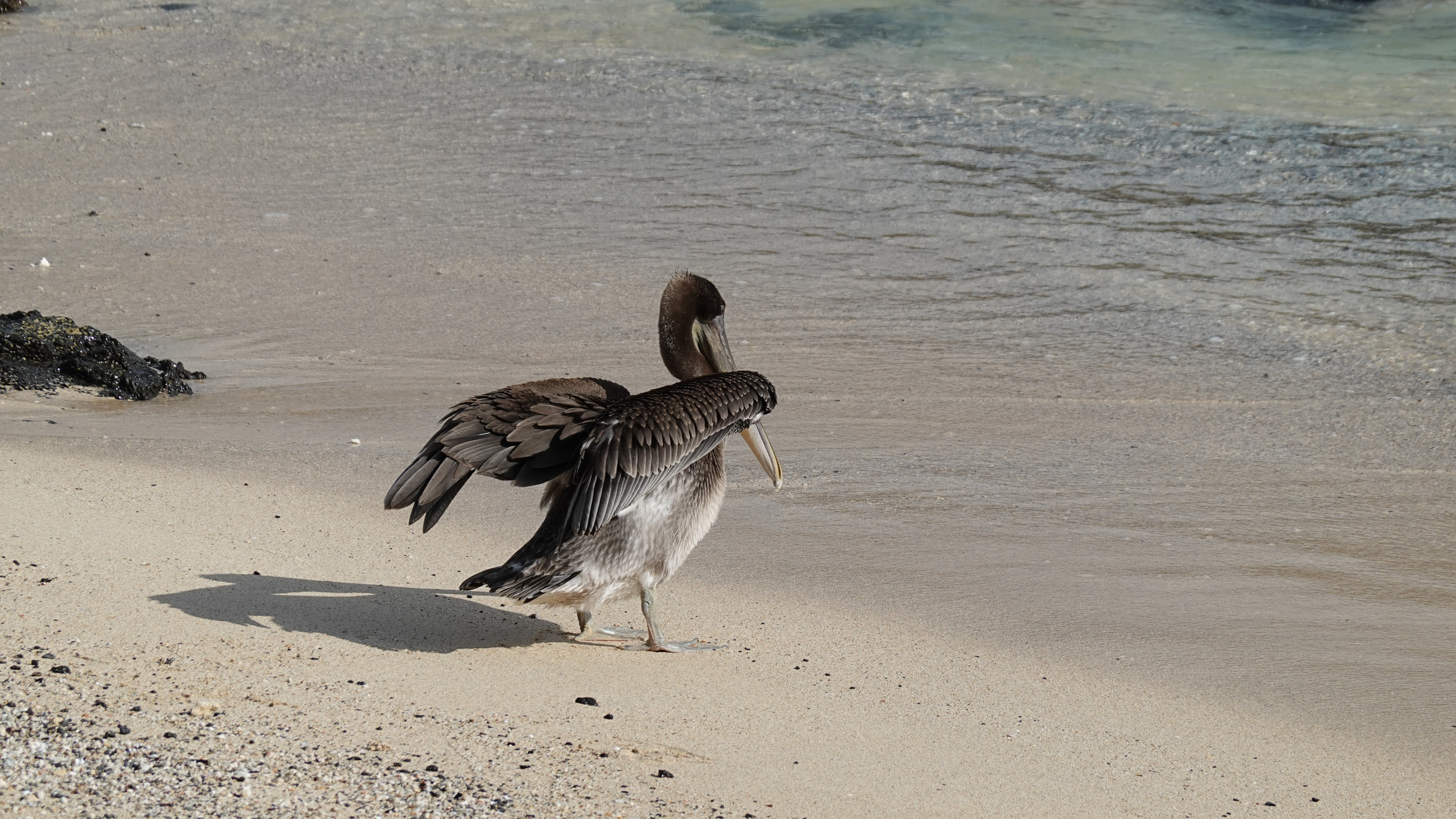 Pelican on lava, Santiago, Galapagos, Ecuador