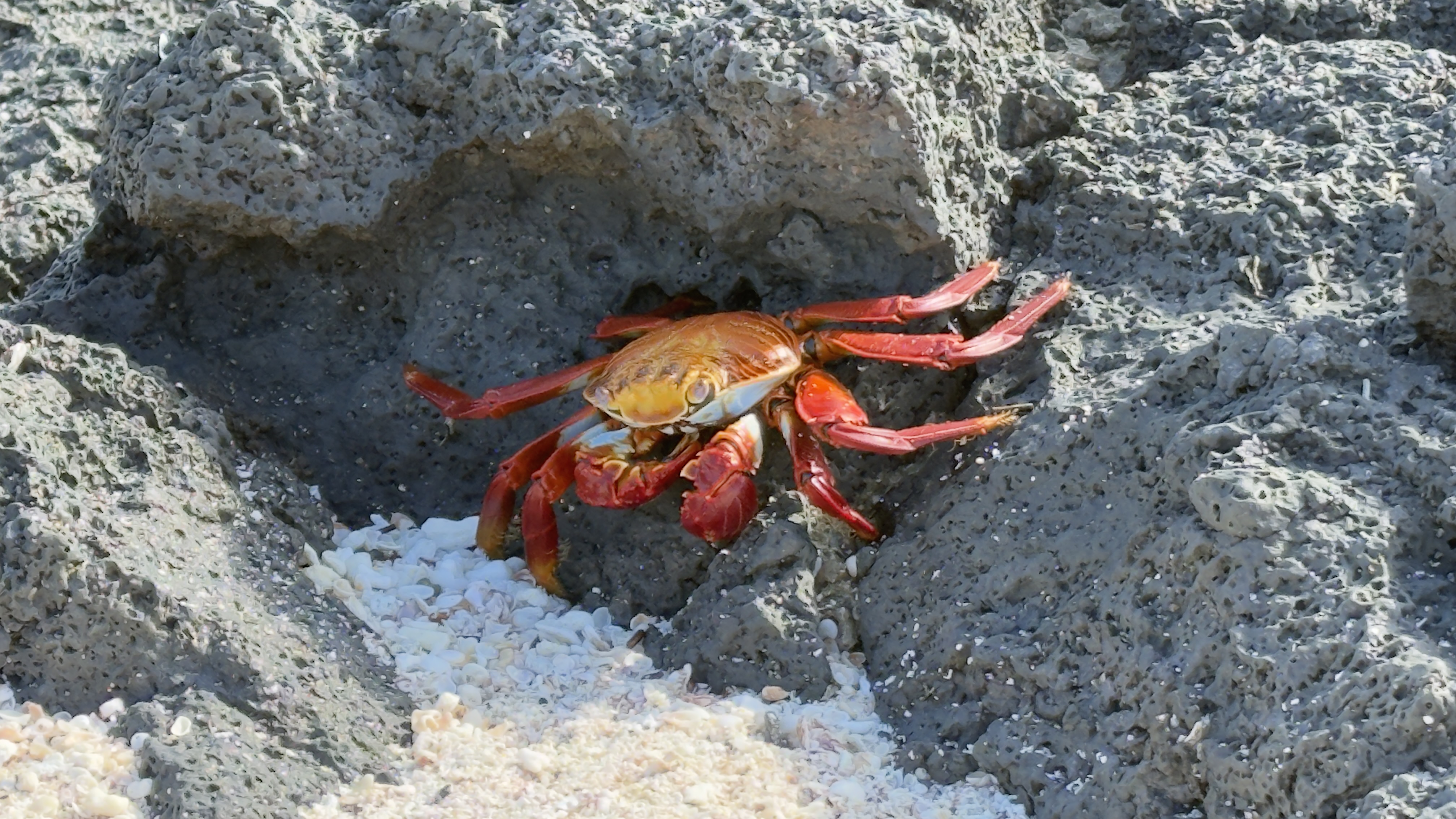 Sally Lightfoot crab attack, San Cristobal Island, Galapagos, Ecuador